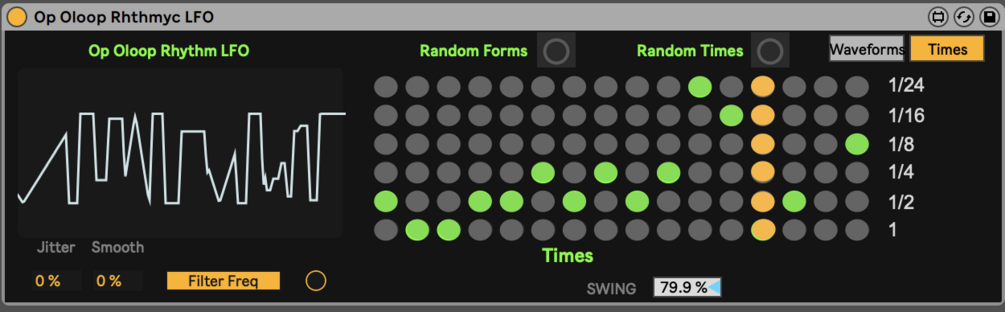 Instead a classic LFO, Op Oloop Rhythm LFO is a sequential LFO, you can sequence the waveforms, the times divisions and randomize both to get crazy and rhythmical modulations.